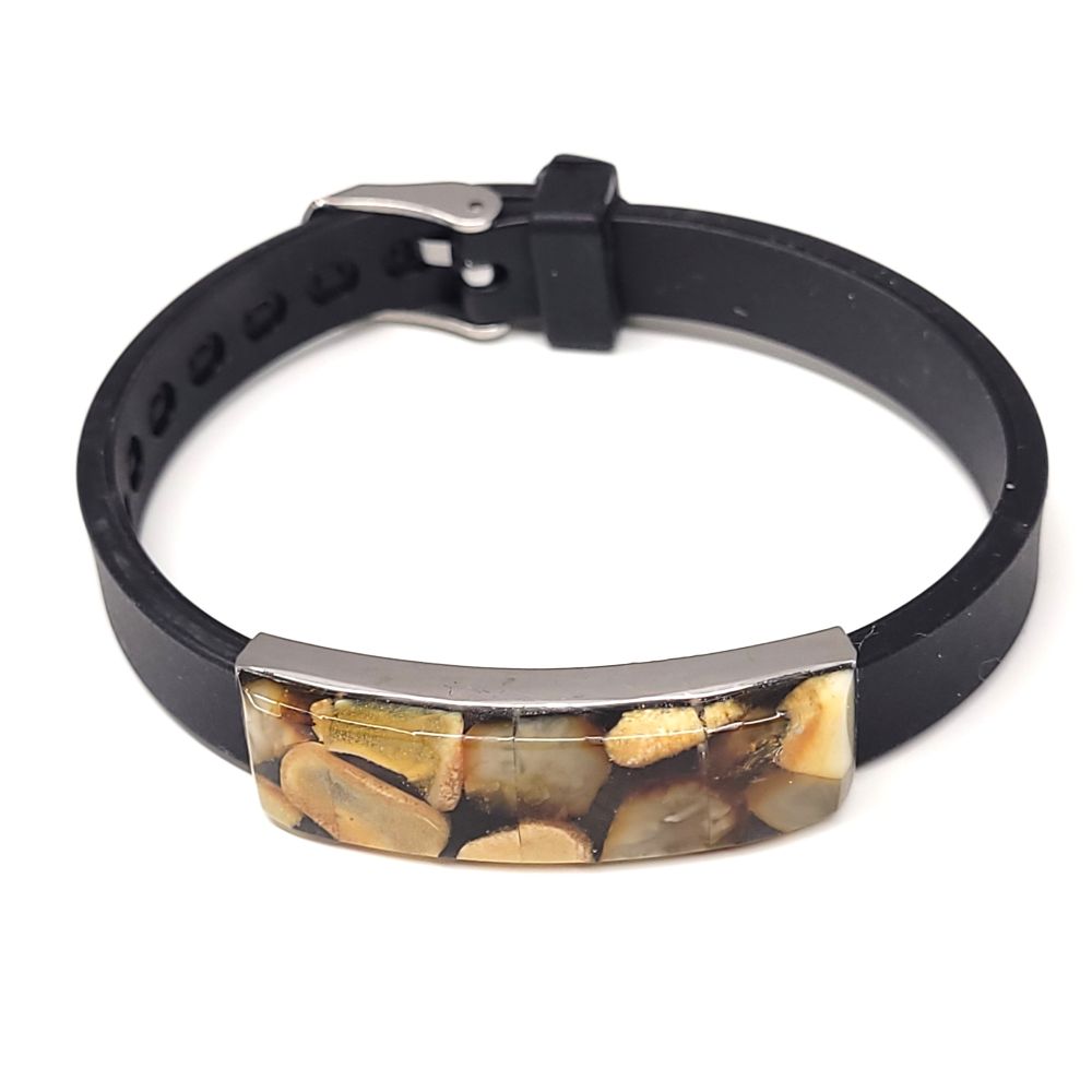 Bursztyn naturalny, żywica, silikon, stal chirurgiczna.