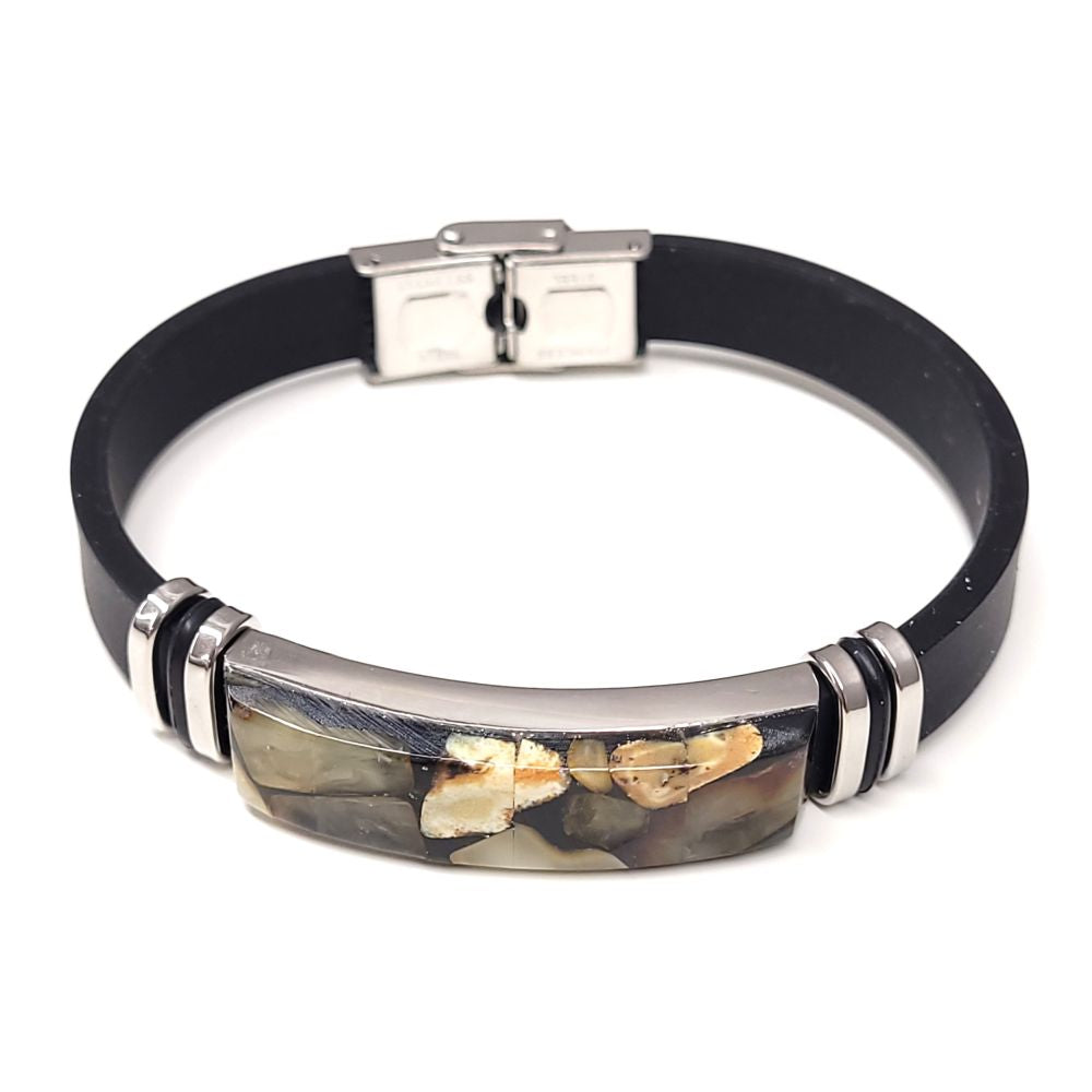 Bursztyn naturalny, żywica, silikon, stal chirurgiczna.
