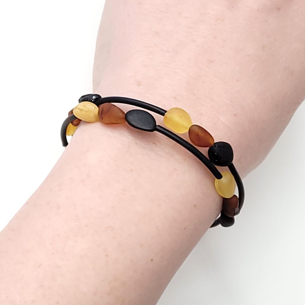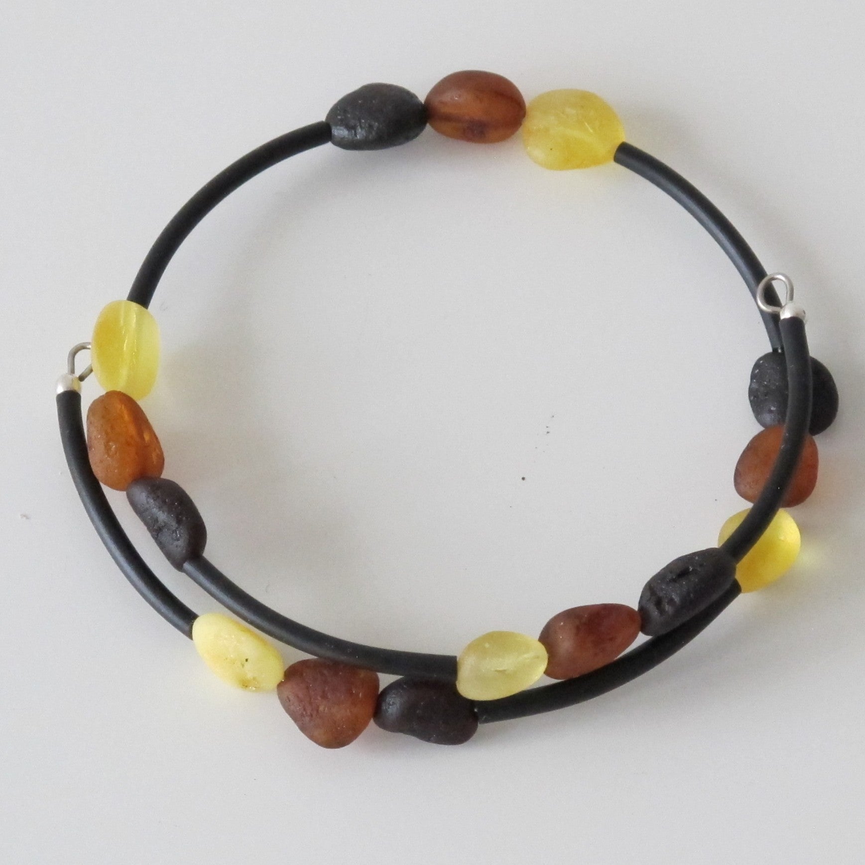 Bursztyn naturalny, drut pamięciowy, silikon.