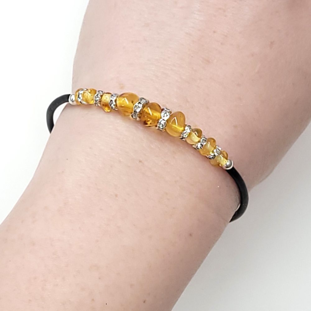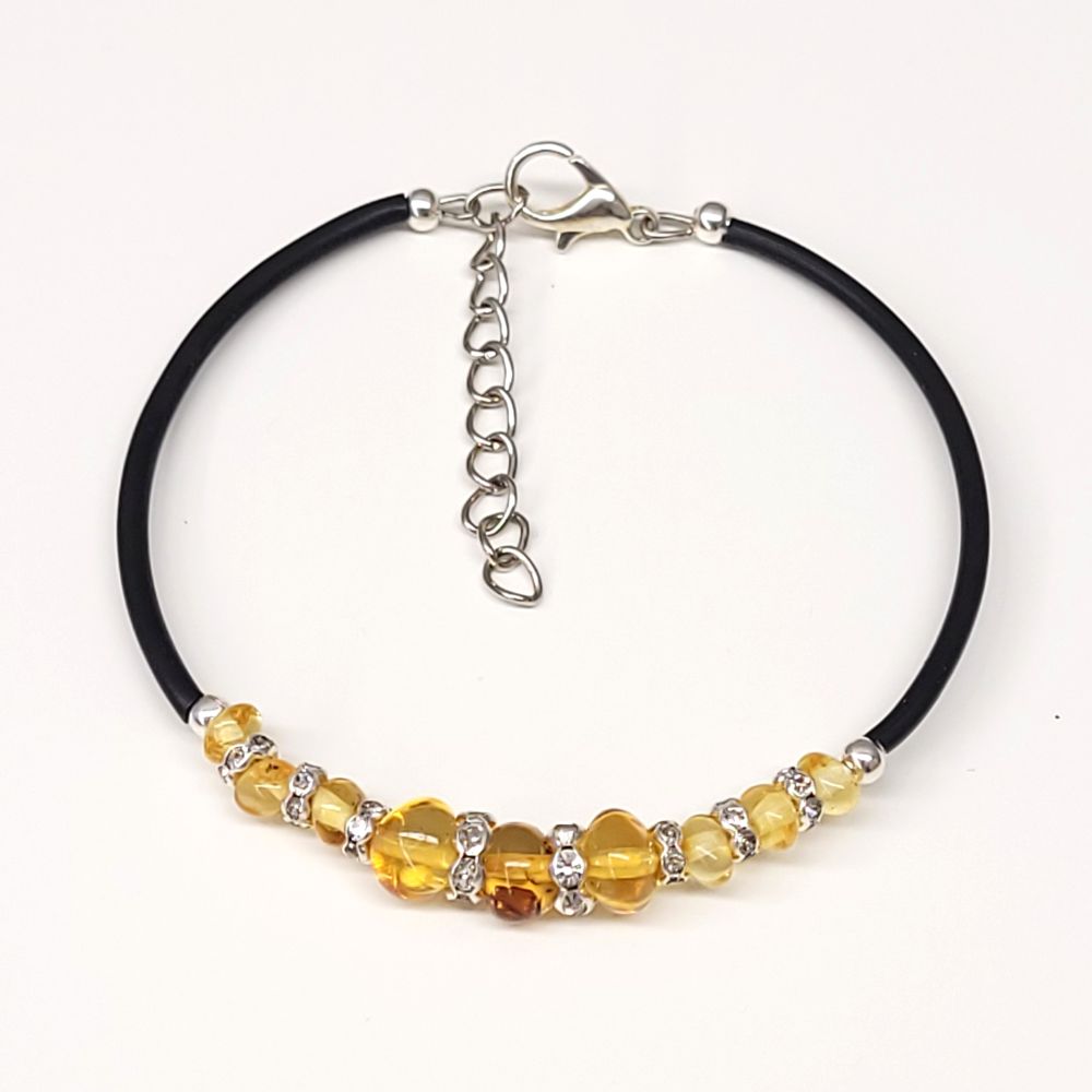 Bursztyn naturalny, drut pamięciowy, silikon, metal jubilerski, kryształki sztuczne.