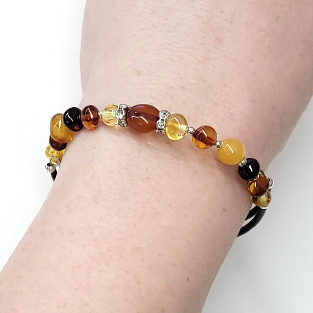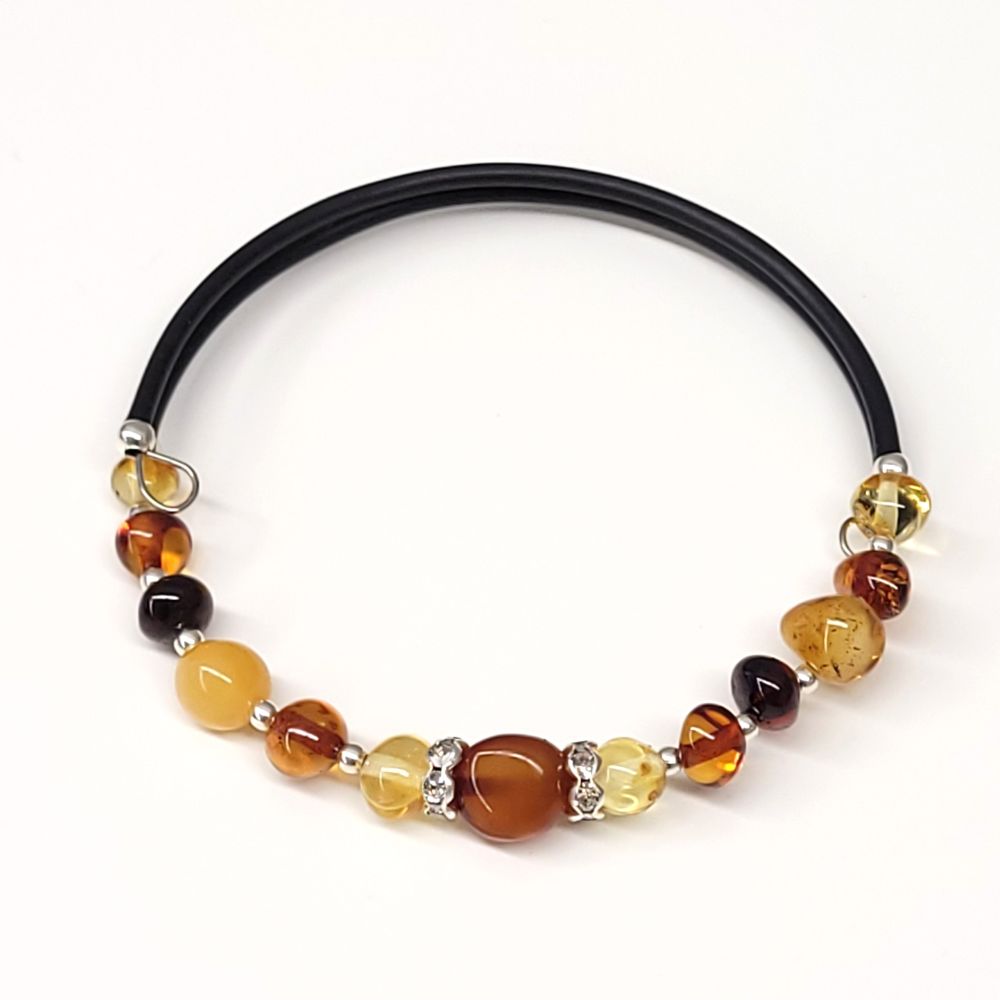 Bursztyn naturalny, drut pamięciowy, silikon, metal jubilerski, kryształki sztuczne.