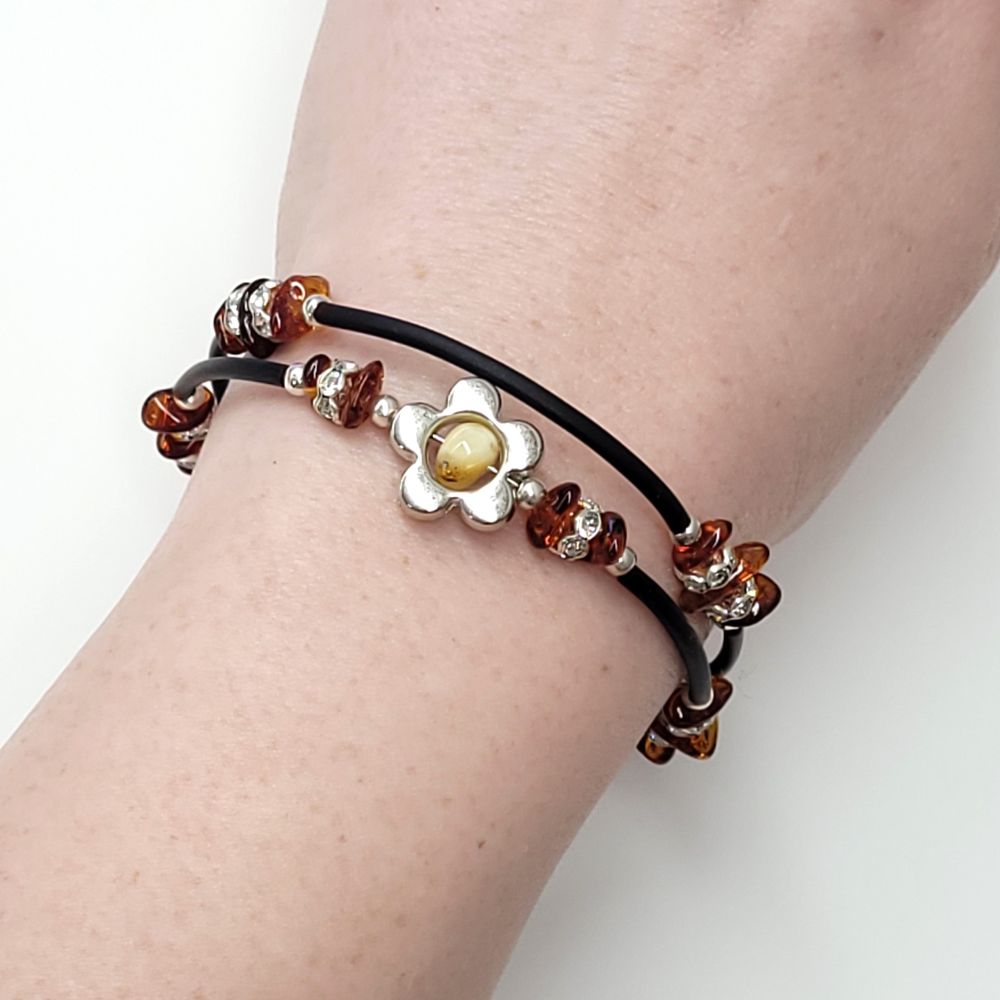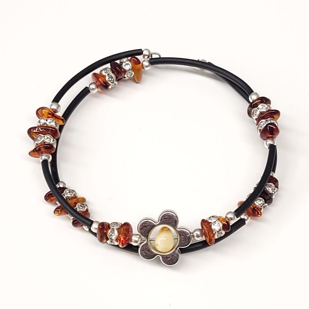 Bursztyn naturalny, drut pamięciowy, silikon, metal jubilerski, kryształki sztuczne.