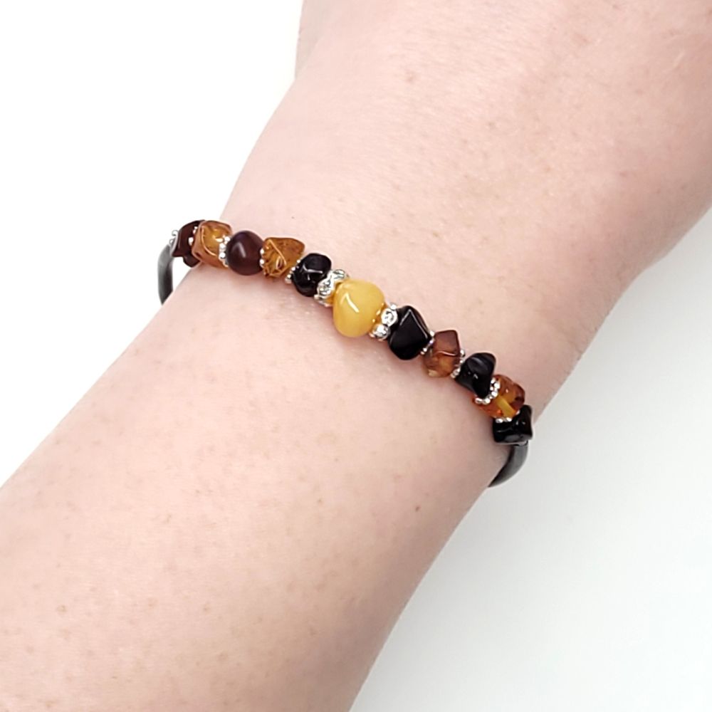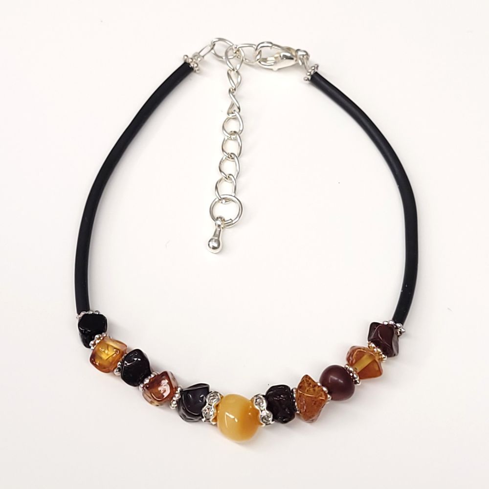Bursztyn naturalny, linka jubilerska, silikon, metal jubilerski, kryształki sztuczne.