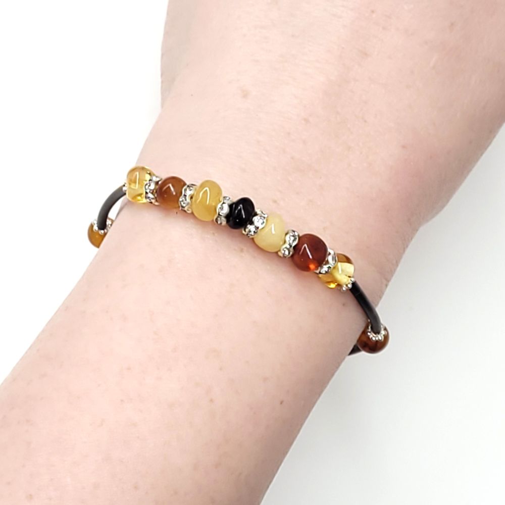 Bursztyn naturalny, linka jubilerska, silikon, metal jubilerski, kryształki sztuczne.