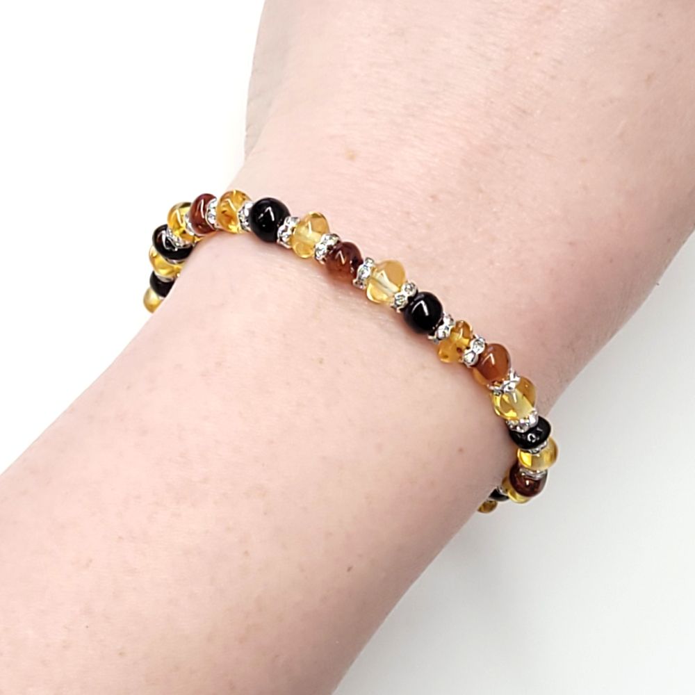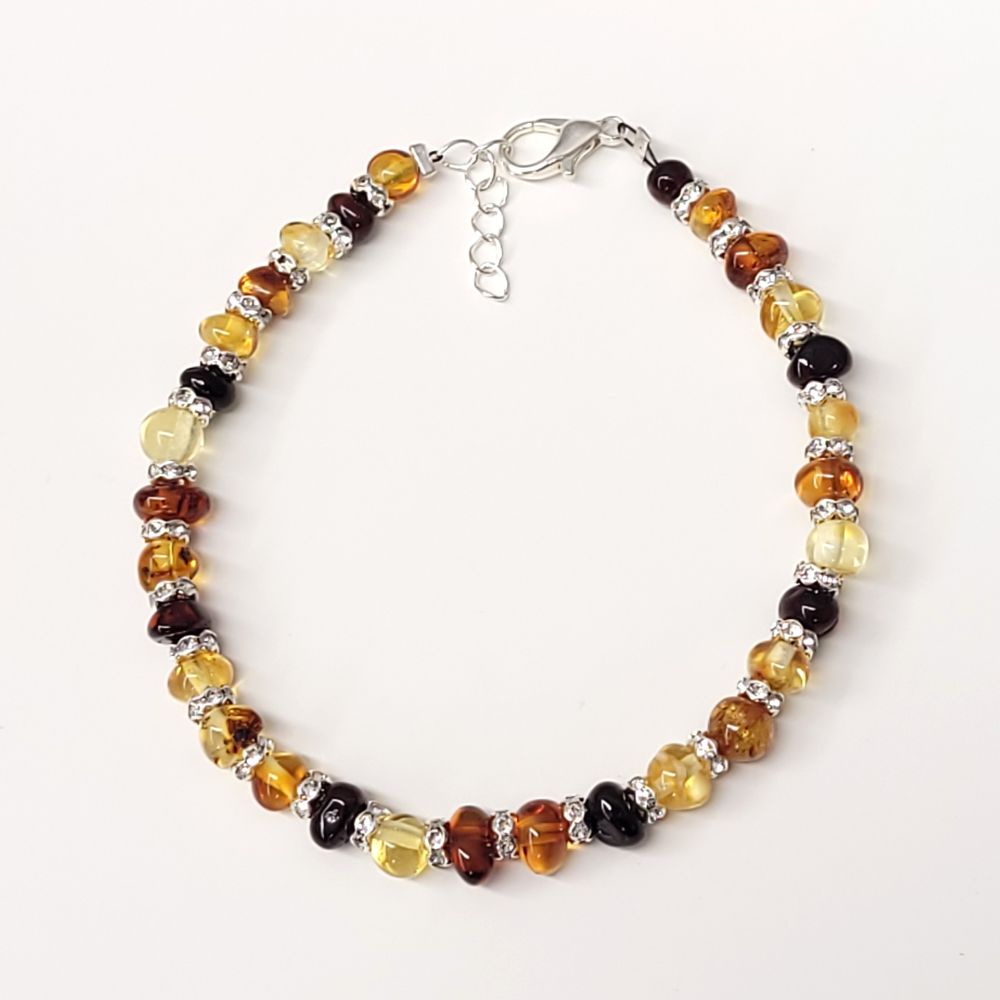Bursztyn naturalny, linka jubilerska, metal jubilerski, kryształki sztuczne.