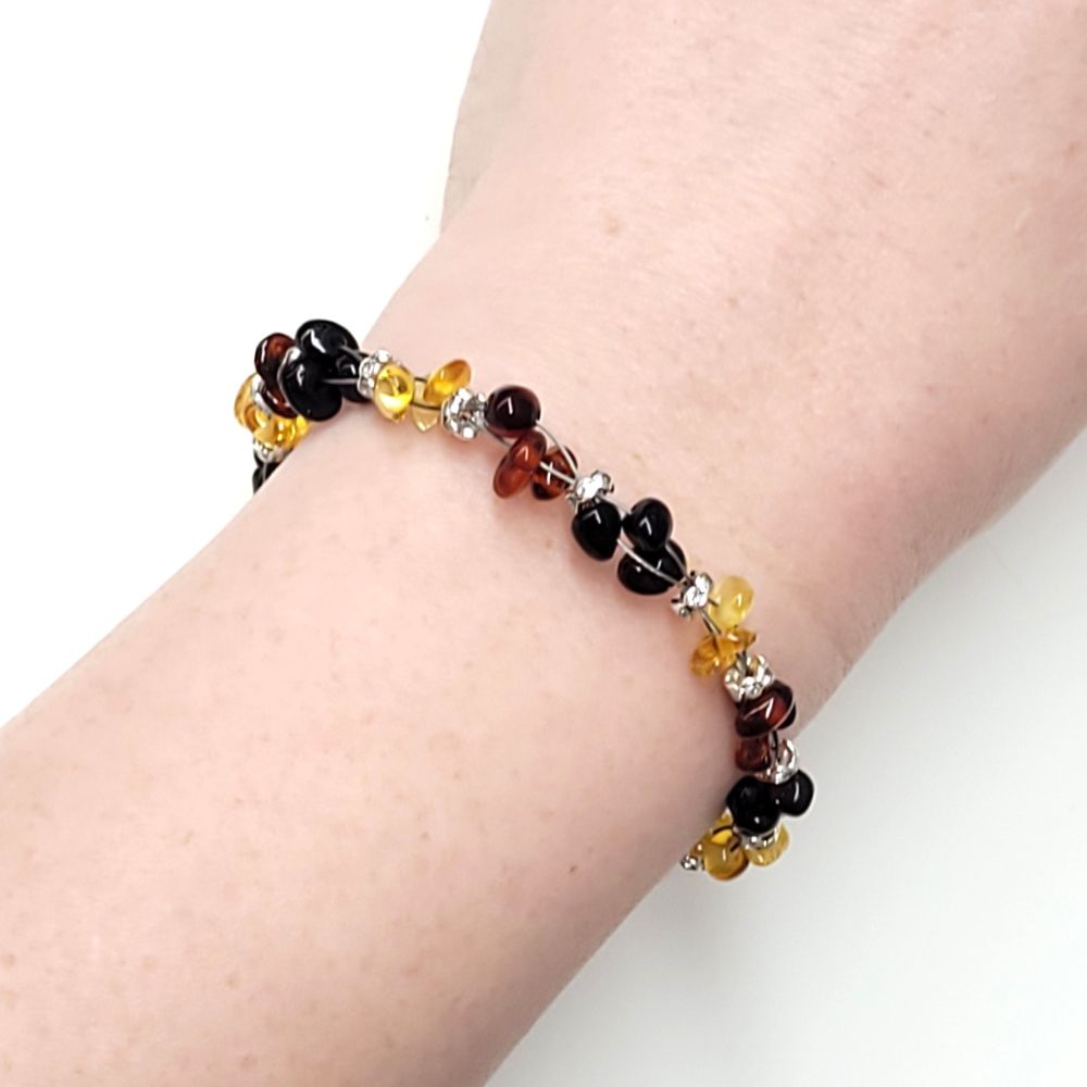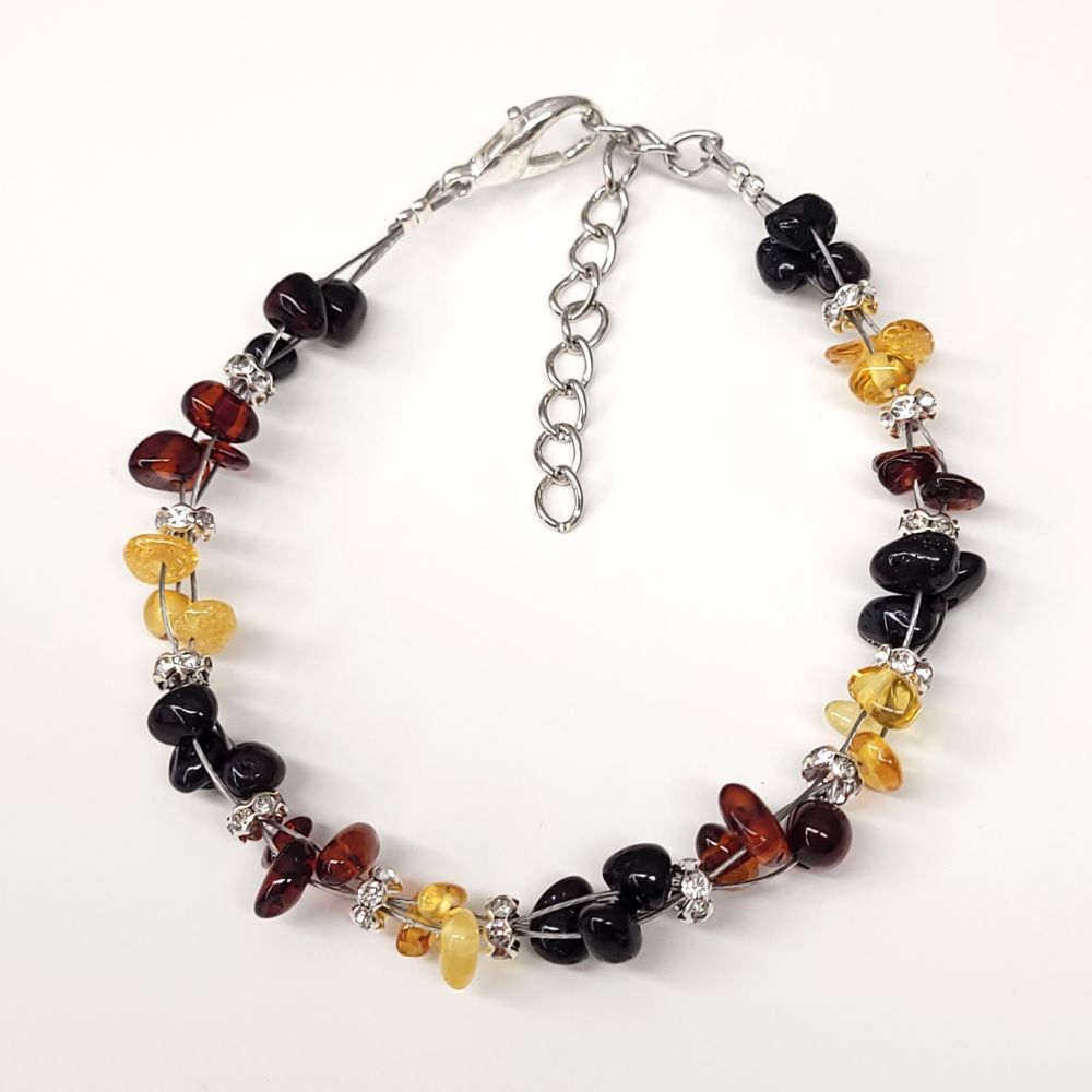 Bursztyn naturalny, linka jubilerska, metal jubilerski, kryształki sztuczne.