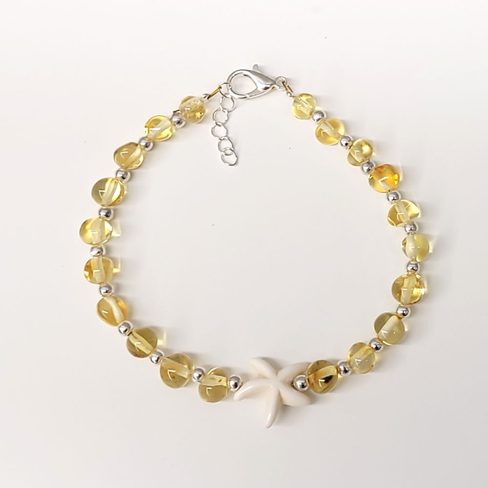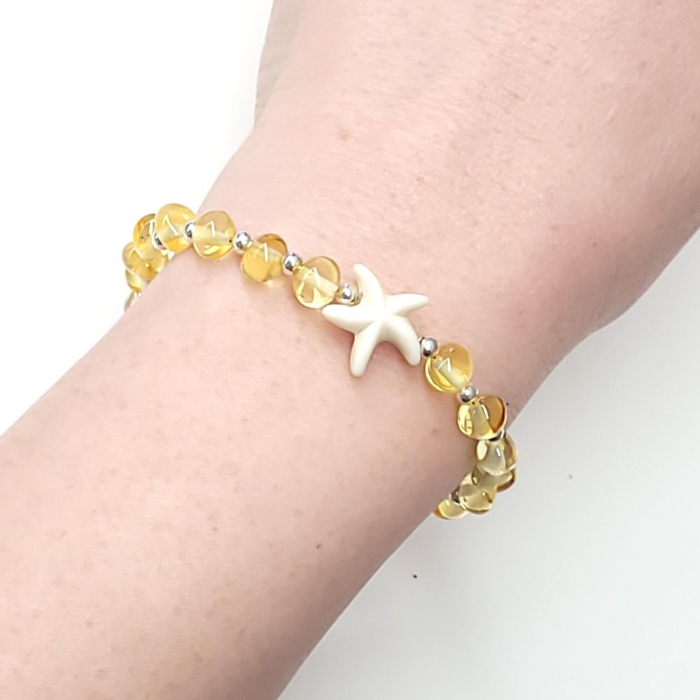 Bursztyn naturalny, rozgwiazdy ceramiczne, muszla naturalna, linka jubilerska, metal jubilerski.