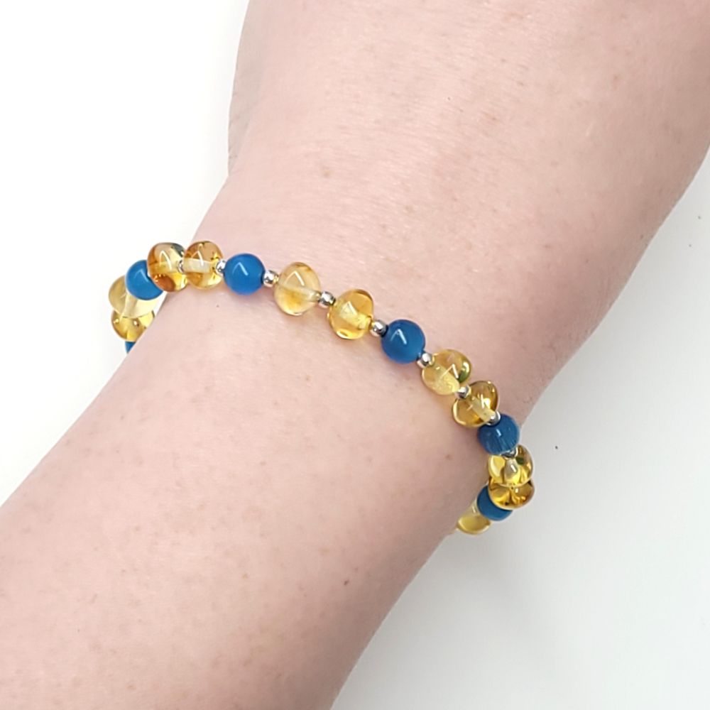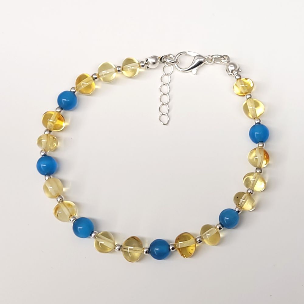 Bursztyn naturalny, kocie oko syntetyczne, linka jubilerska, metal jubilerski.