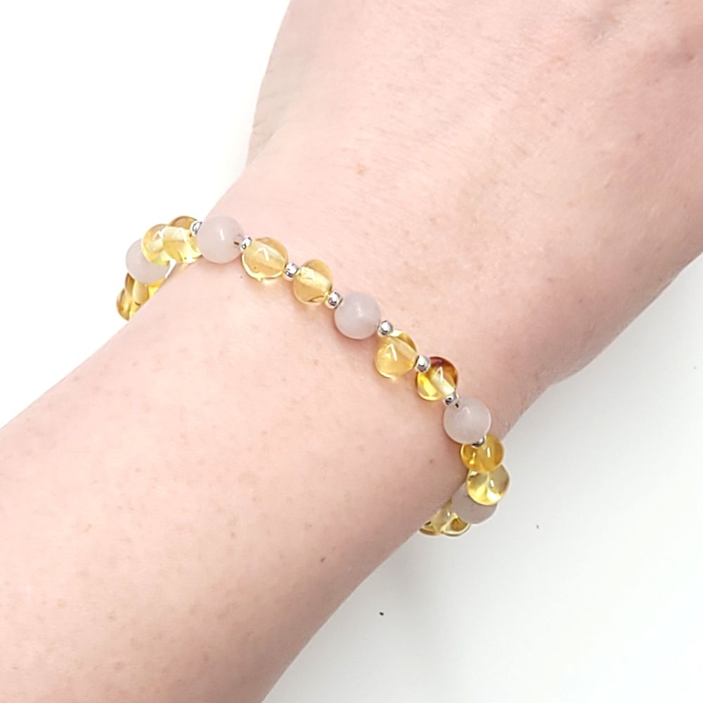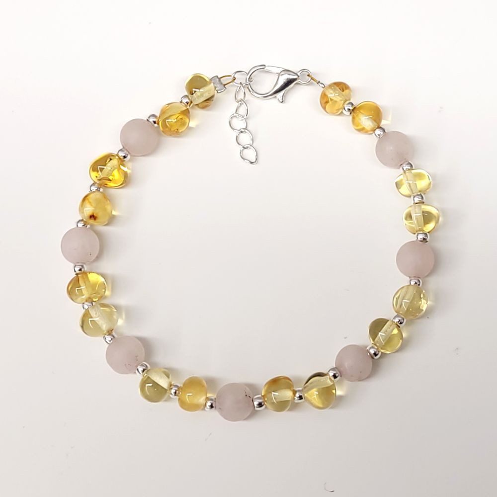 Bursztyn naturalny, kwarc różowy, linka jubilerska, metal jubilerski.