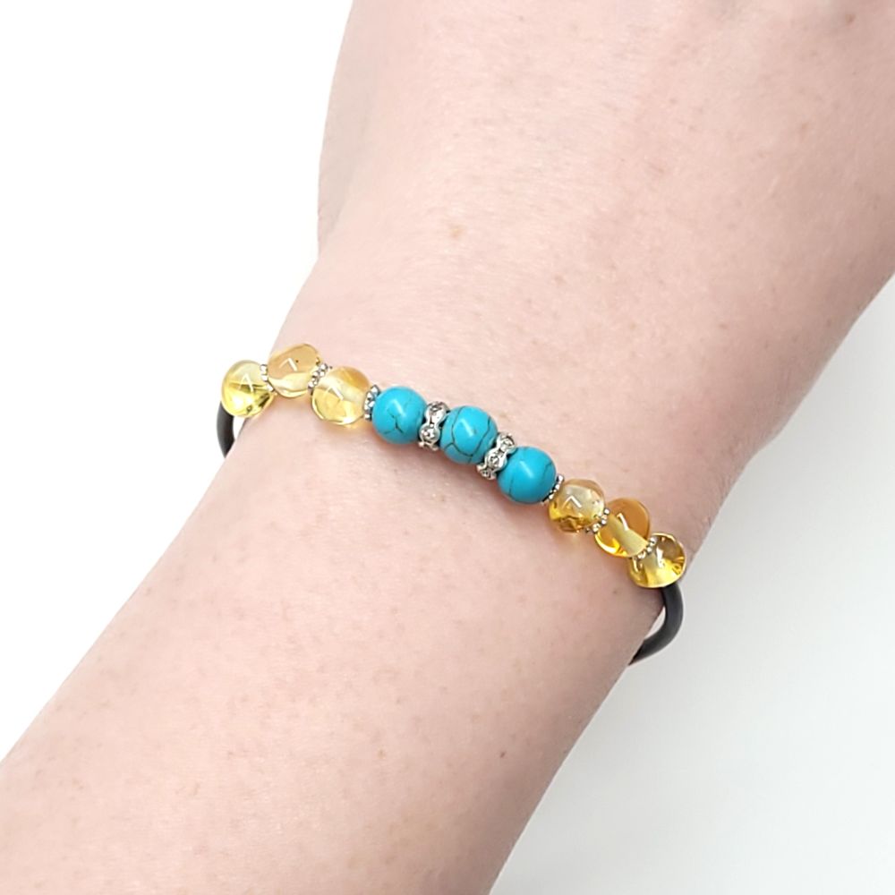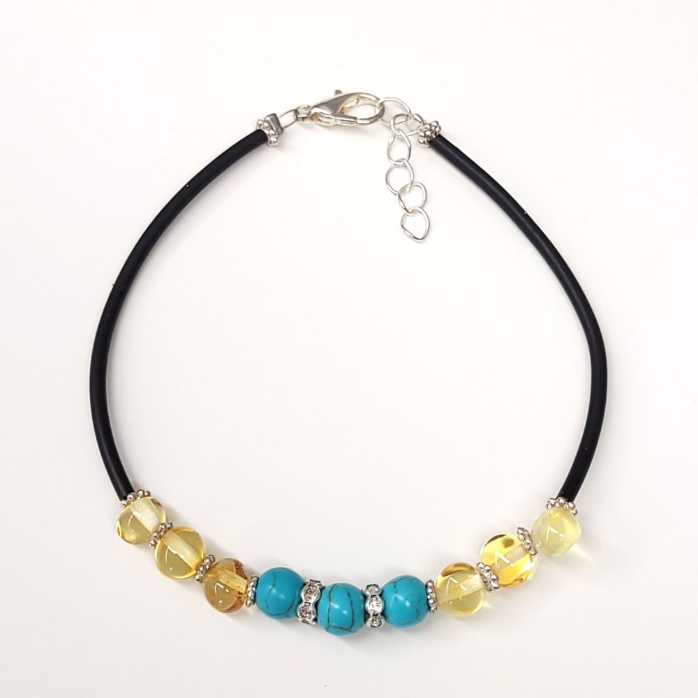 Bursztyn naturalny, howlit, linka jubilerska, silikon, metal jubilerski, kryształki sztuczne.