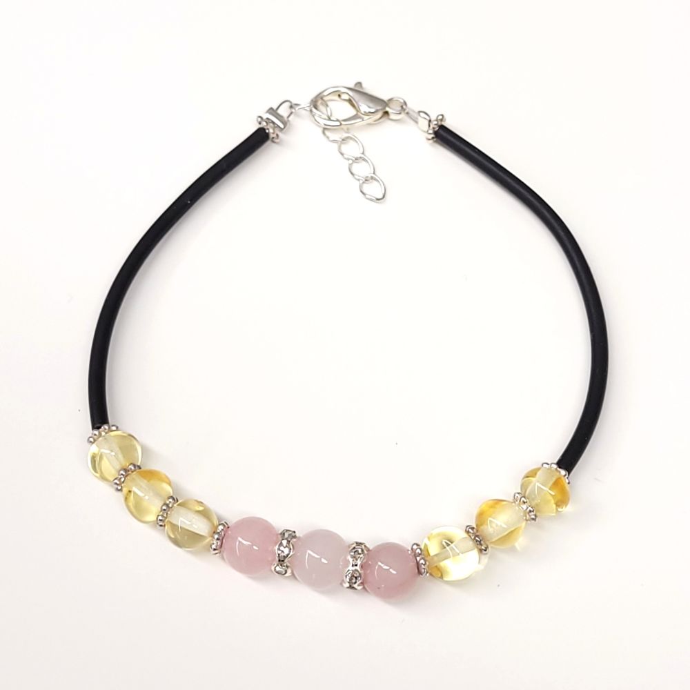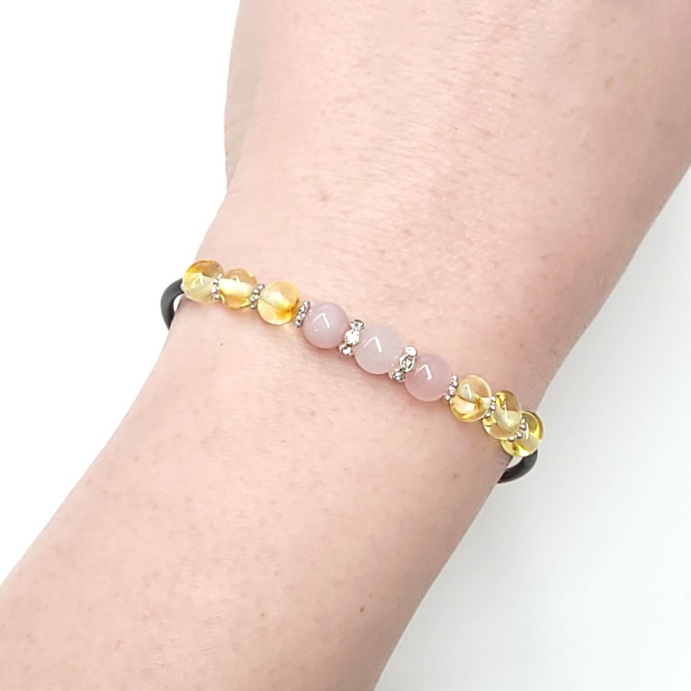 Bursztyn naturalny, kwarc różowy, linka jubilerska, silikon, metal jubilerski, kryształki sztuczne.