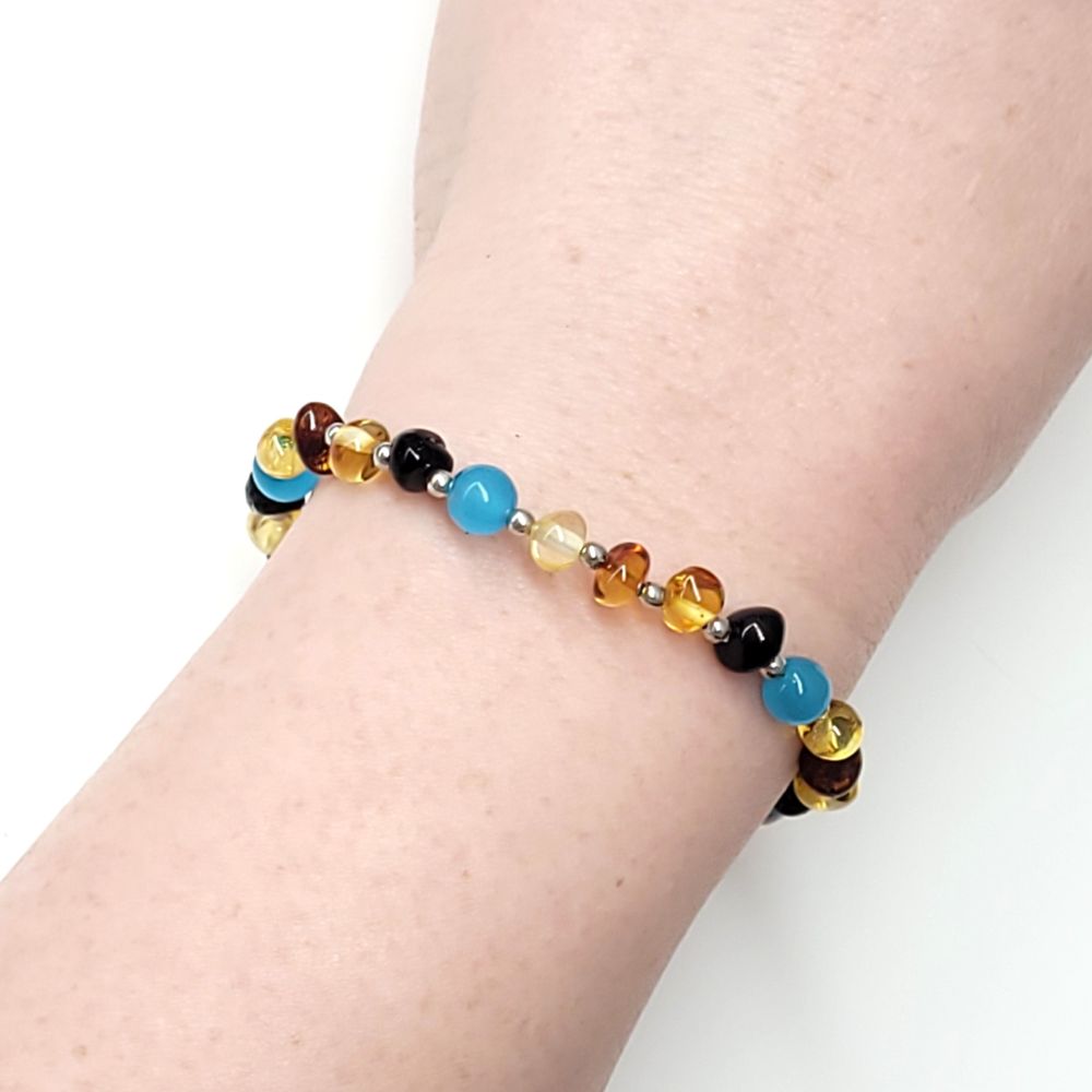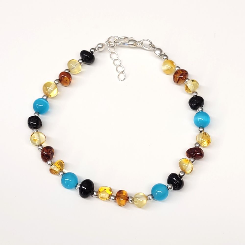 Bursztyn naturalny, kocie oko syntetyczne, linka jubilerska, metal jubilerski.