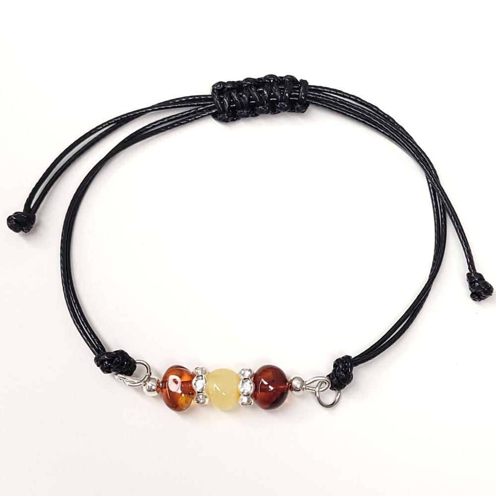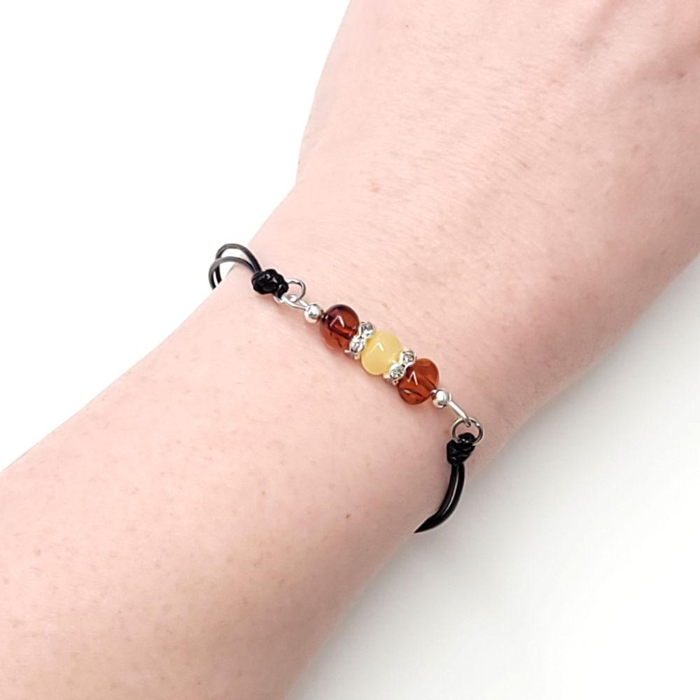 Bursztyn naturalny, sznurek jubilerski, metal jubilerski, kryształki sztuczne.