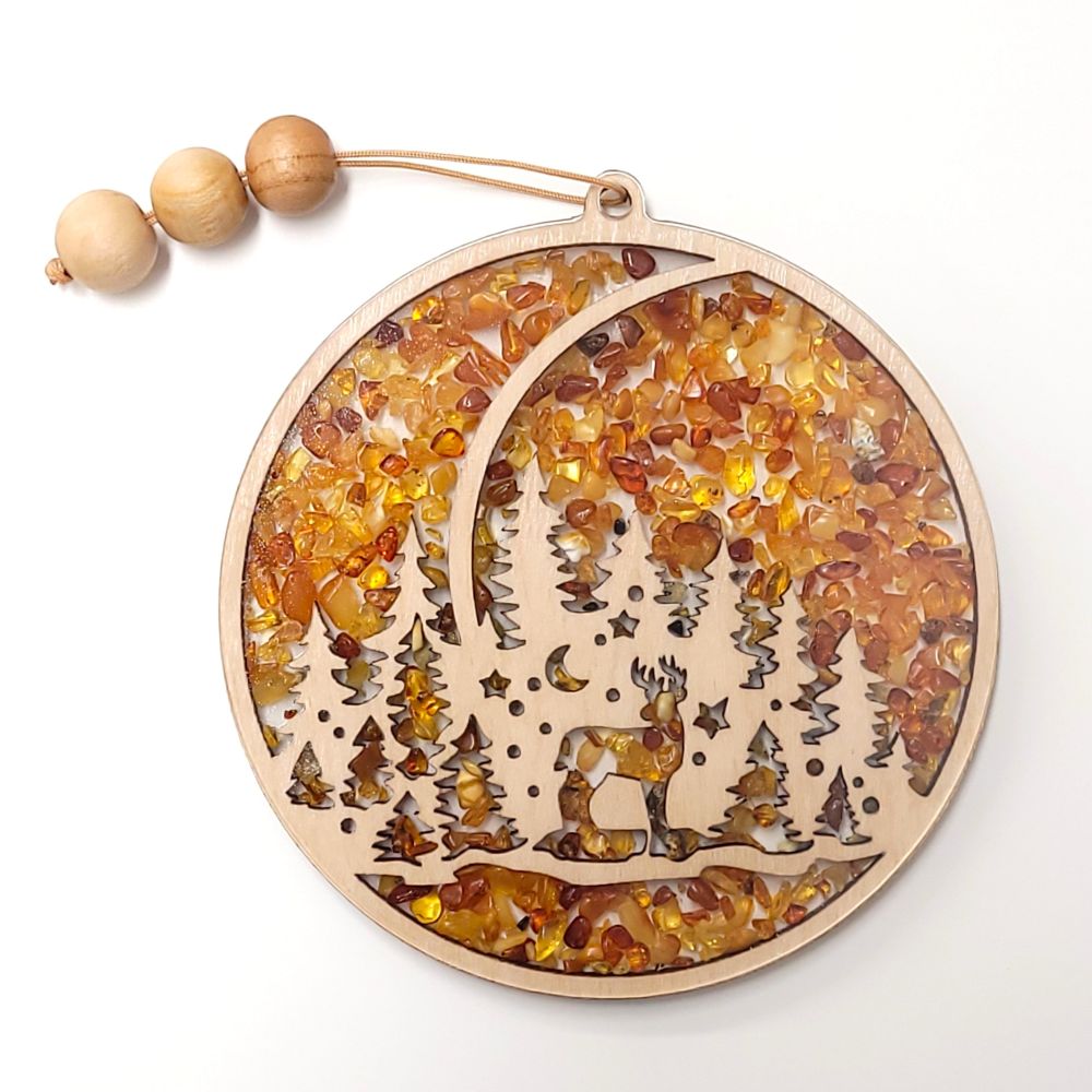 Bursztyn naturalny, sklejka brzozowa, plexiglas.