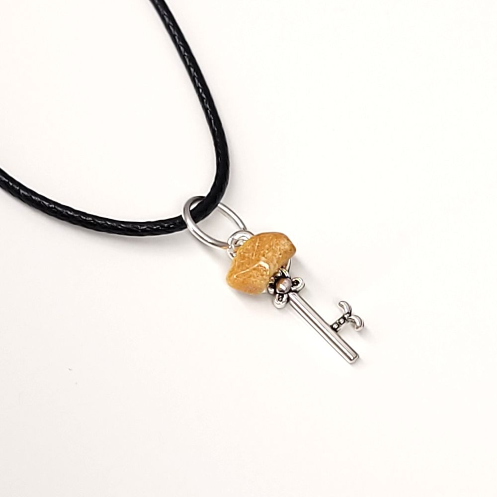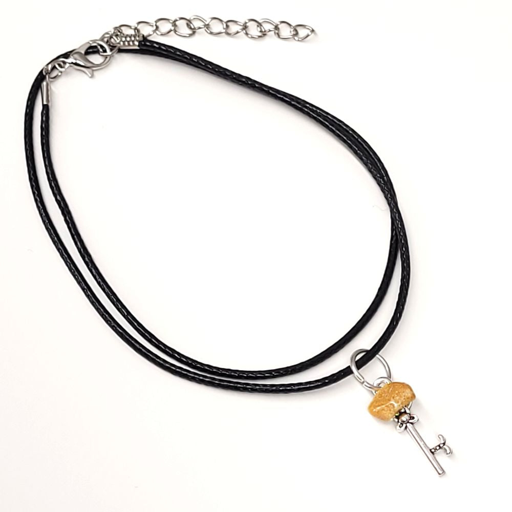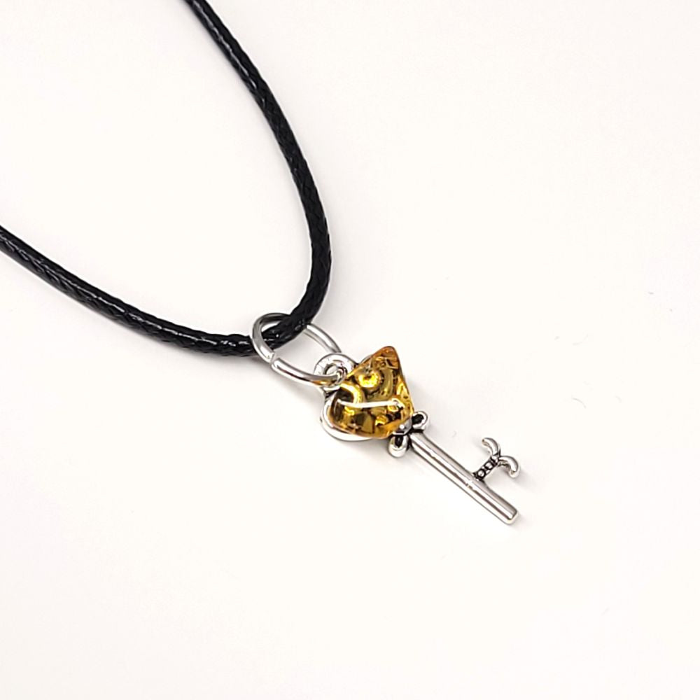 Bursztyn naturalny, metal jubilerski, sznurek jubilerski.