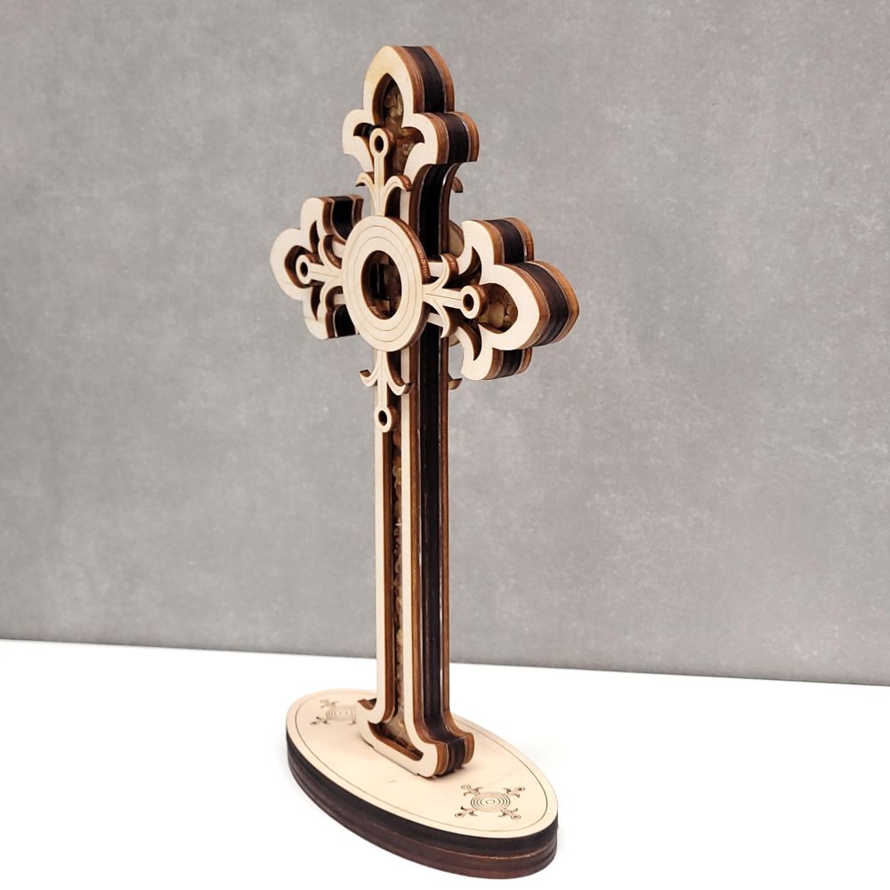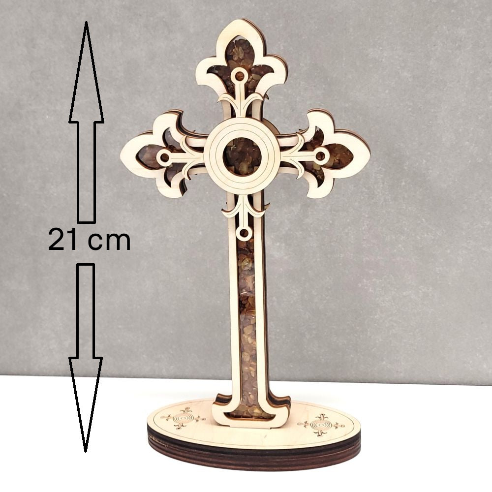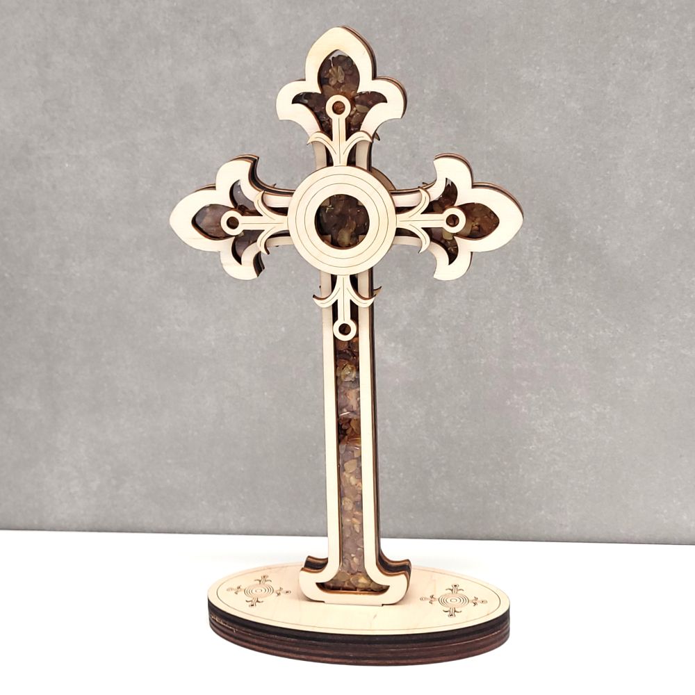 Bursztyn naturalny, sklejka brzozowa, plexiglas.