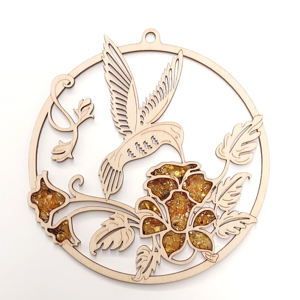 Bursztyn naturalny, sklejka brzozowa, magnesy.